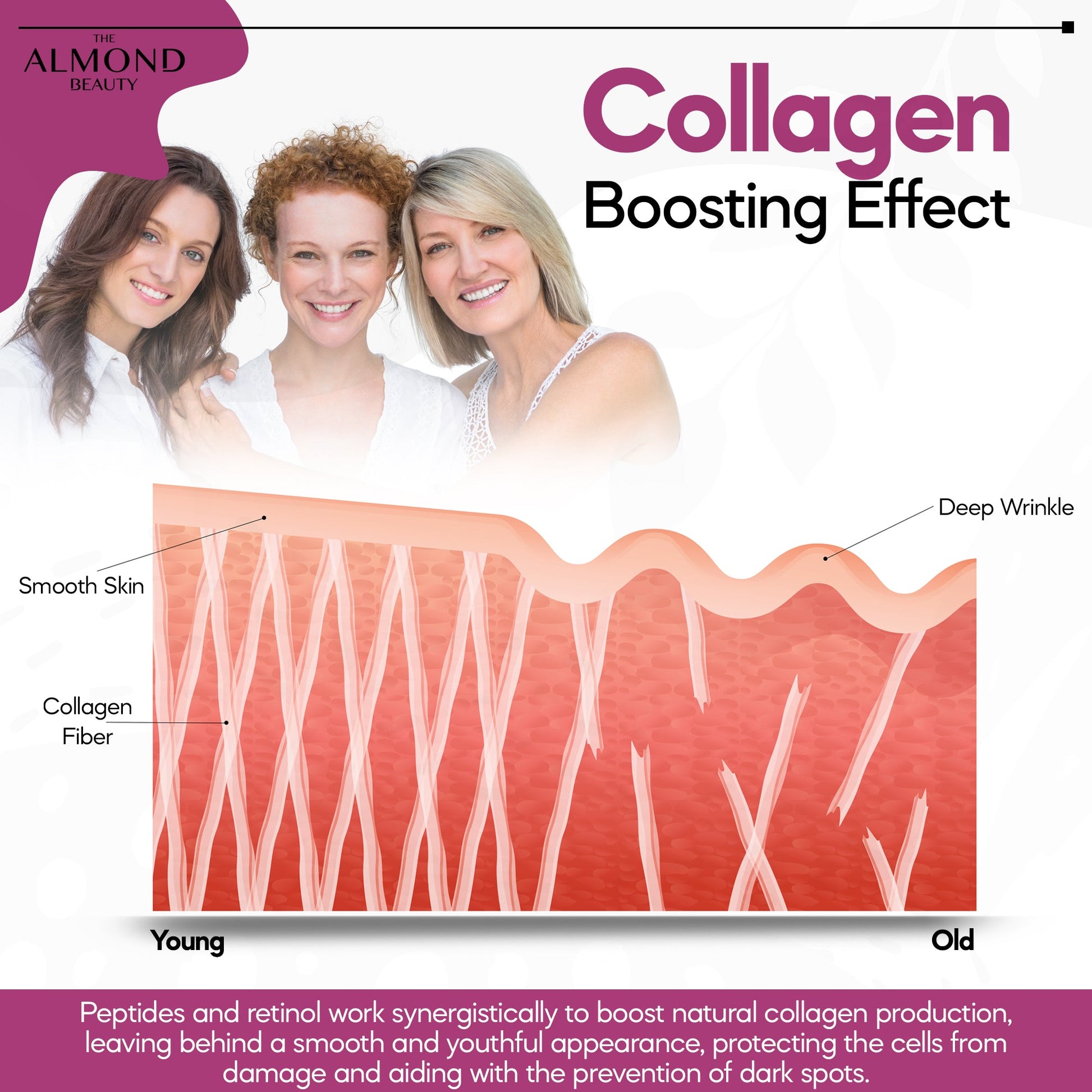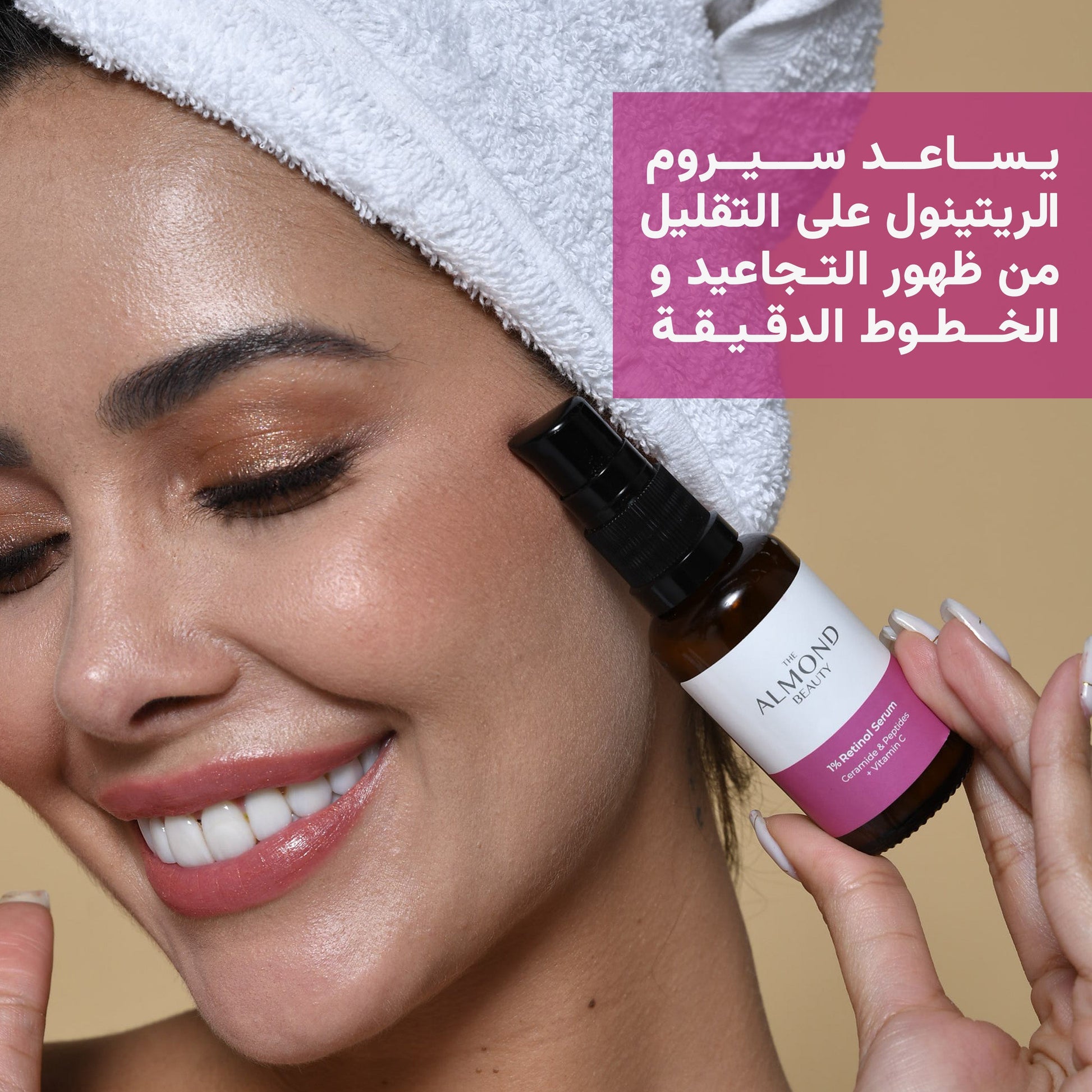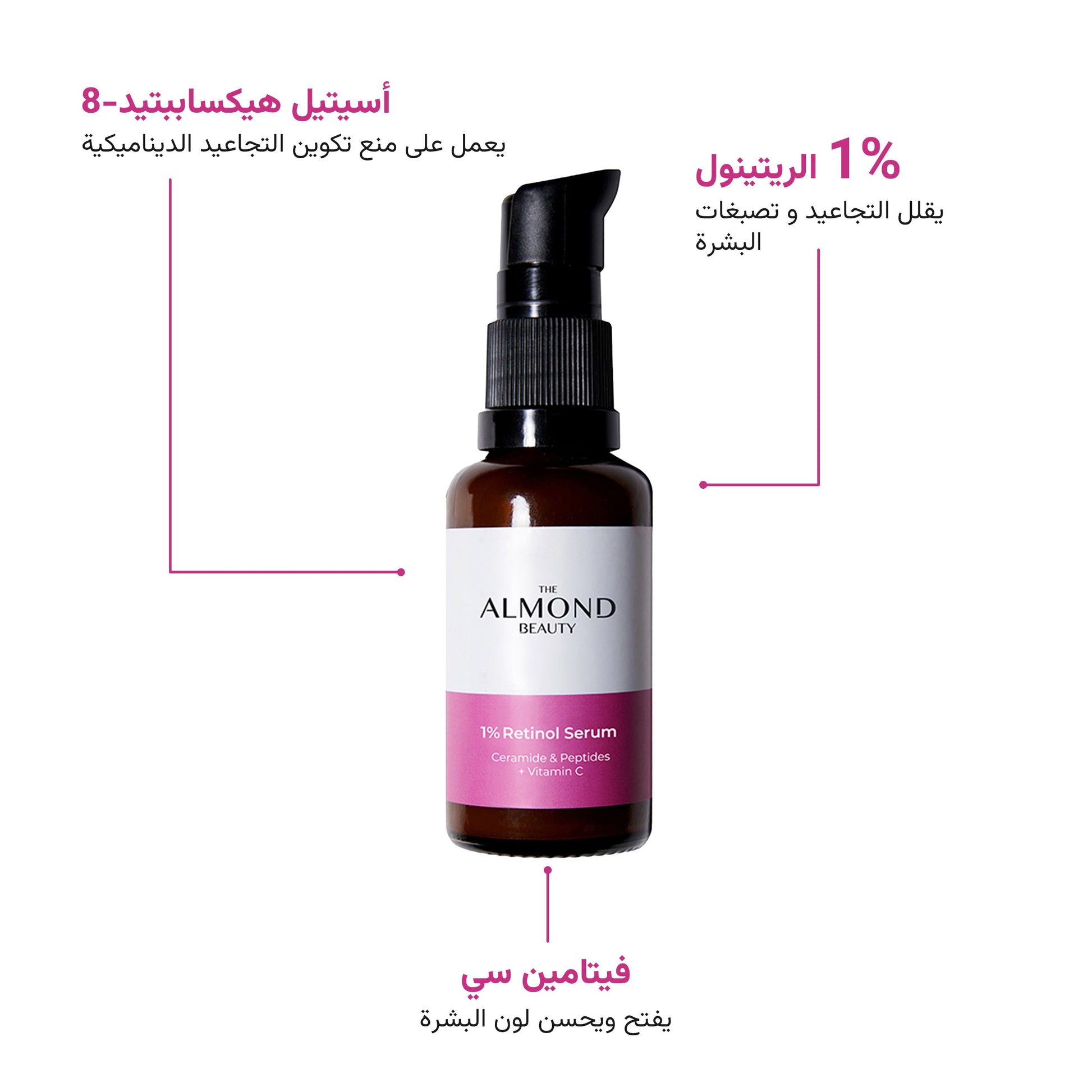 The Almond Beauty Retinol Repair Serum combines 1% Retinol, Peptides, Vitamin C, and Ceramide to visibly reduce wrinkles, improve skin texture, and restore youthful glow. Retinol boosts collagen production and cell turnover, while peptides enhance elasticity and firmness. Vitamin C brightens and evens skin tone, and ceramides strengthen the skin barrier for lasting hydration. With its lightweight, fast-absorbing formula, this serum is perfect for nighttime use and suitable for all skin types. Use regularly for smoother, firmer, and more radiant skin.
