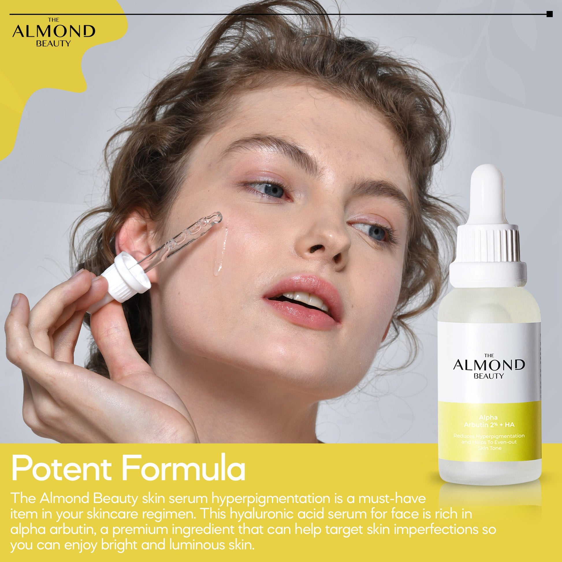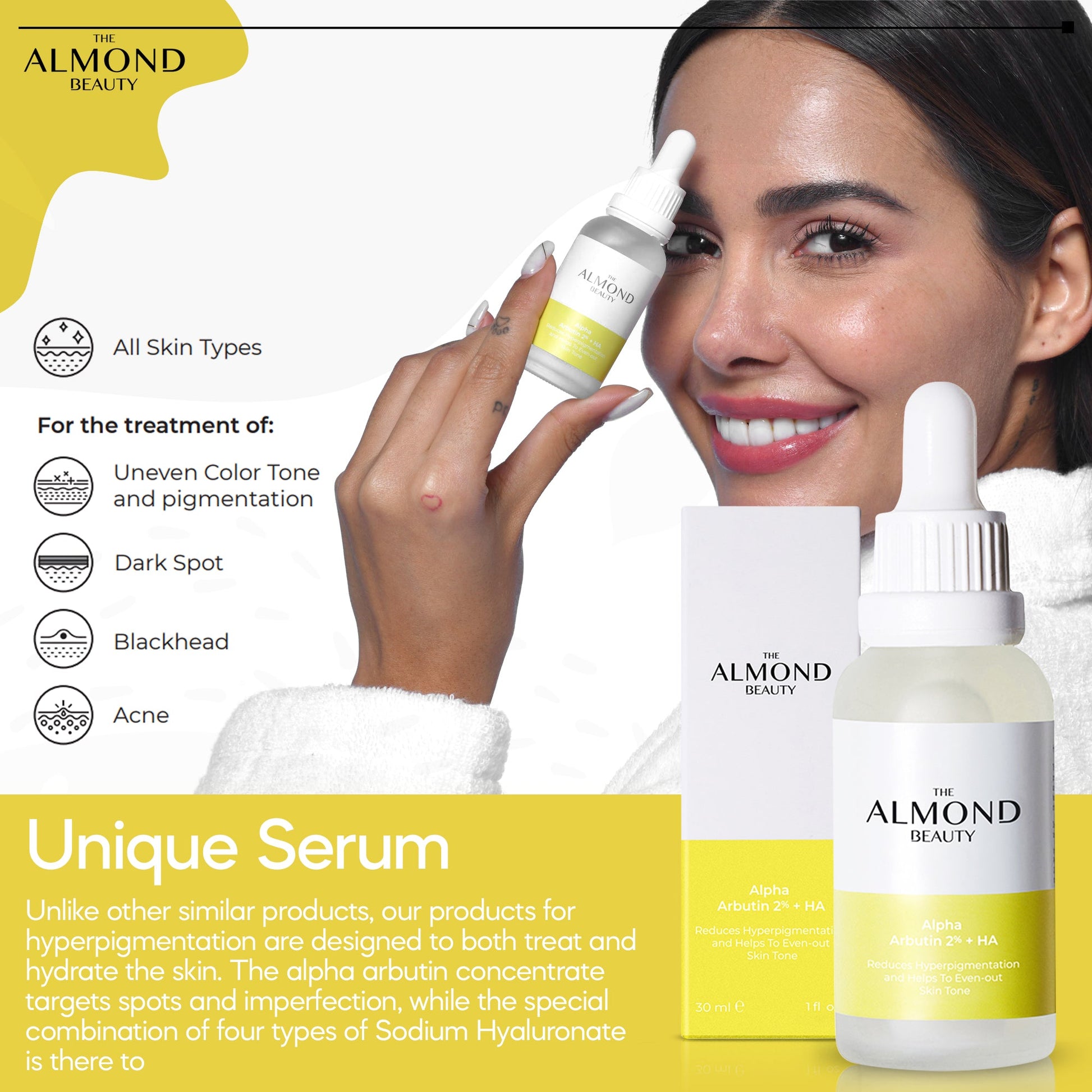 EvenTone Alpha 2% Serum by The Almond Beauty combines 2% Alpha Arbutin and Hyaluronic Acid to visibly reduce dark spots and brighten uneven skin tone. This lightweight, fast-absorbing formula deeply hydrates while fading pigmentation for a smoother, more radiant complexion. Suitable for all skin types, it delivers balanced tone and lasting glow with every use.