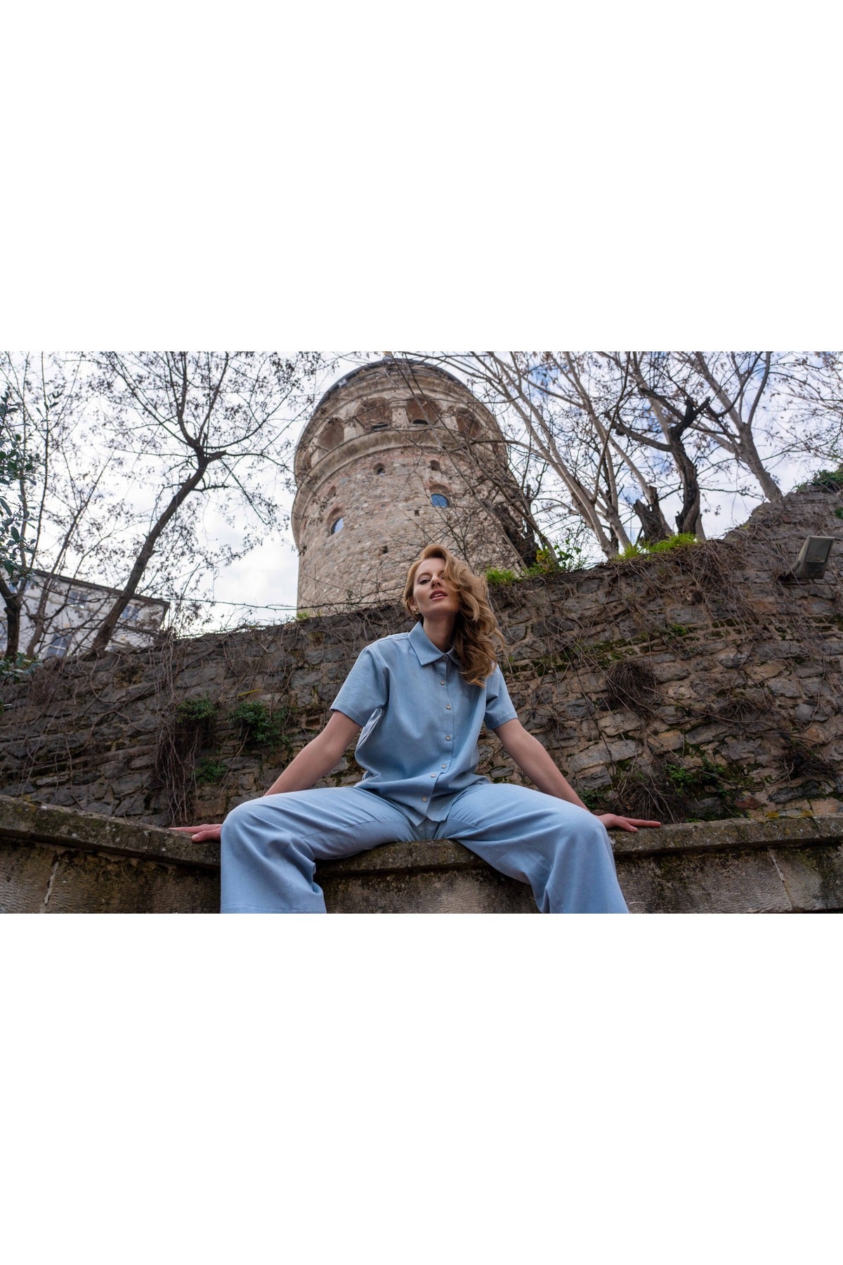 Woman Short Sleeve Buttoned Wrist Length Pants Set